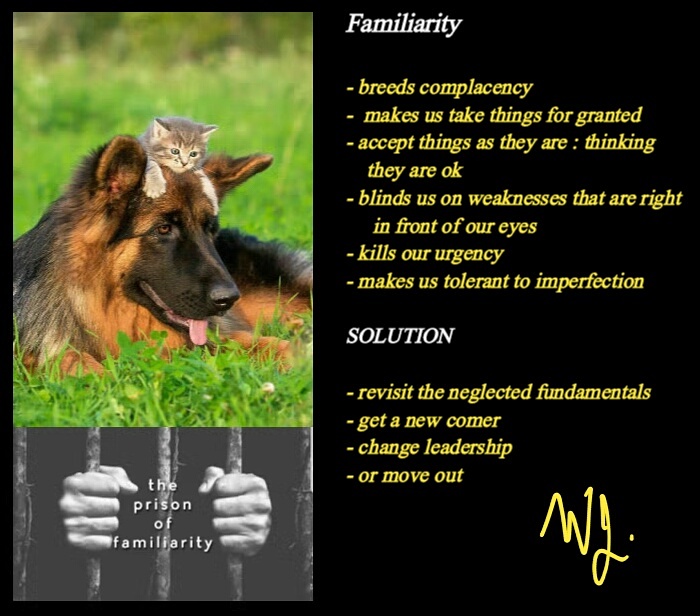 ” Familliarity ” will not be good for one’s soul nor to the people surrounding you ; be it internal or external customers. The competitive winning instict and speed will be missing. An overdose of flexibility & tolerance will prevail.